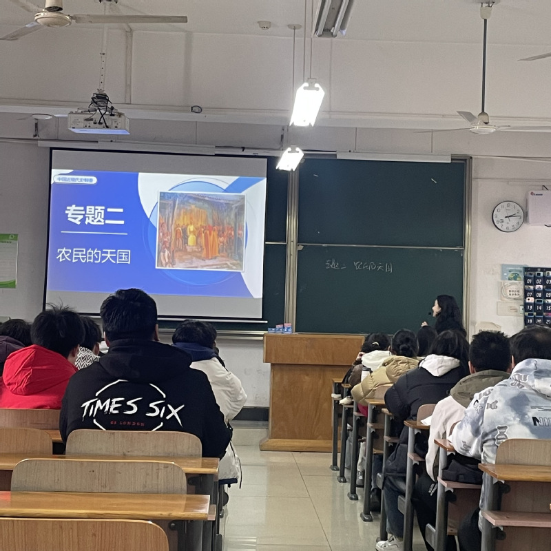 教师冯菲为学生讲解《纲要》专题二“农民的天国”的第一、二节内容。冯菲老师以问题导向为切入口,通过讲解太平天国运动前农村社会的变动、太平军起义以及制度和纲领性文件,为我们剖析了农民阶级的局限性。冯菲老师的讲解深入浅出、层层递进,通过课堂提问的方式,不断吸引学生的注意力,巧妙地调动学生的情绪,激发他们积极思考。整个课堂气氛热烈而活跃,学生们思维的火花不断碰撞。同时,冯菲老师还巧妙地运用了历史文献、图片资料等多媒体教学手段,增强课堂的吸引力和感染力,为师生们带来了一堂有滋有味的历史课。