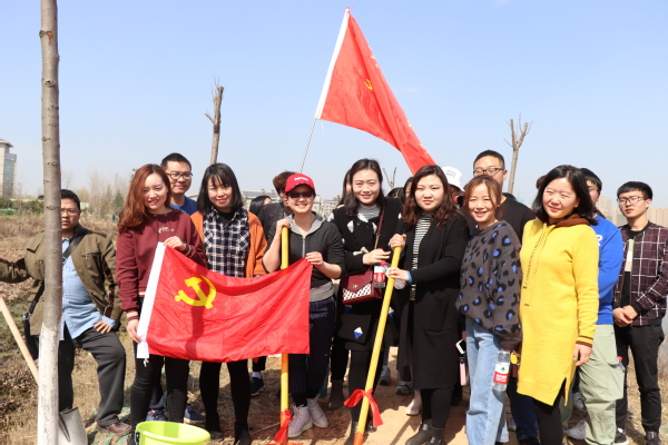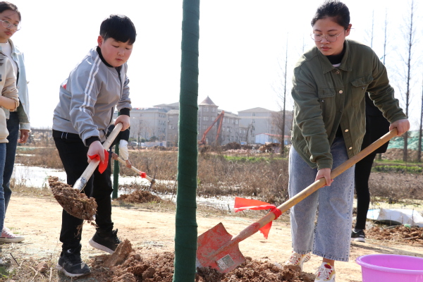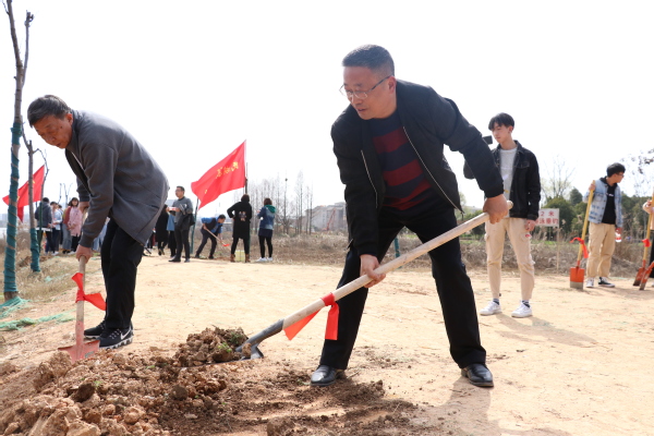 随后,在各位领导的带领下,教职工代表和学生代表们等分别在各自的责任区内开展植树活动。大家分工协作,有的负责挖土刨坑,有的负责填土施肥,有的负责提水灌溉,现场一派忙碌的景象。在专业种植工作人员指导下,在大家的共同努力下,很快一片小树林就初步成型,大家的成就感也油然而生。“再过一个月,大家来看,这里的树都发芽了,校园就更美了”,一位专业种植人员一边检查大家种的树是否合格,一边乐呵呵地对大家说道。