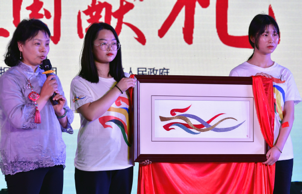 启动仪式上,由汉绣传承人王燕亲手完成的2019黄家湖龙舟文化节汉绣会徽也首次亮相。王燕介绍,这幅会徽是传统汉绣工艺与BB贝博艾弗森官方网站艺术创新的结晶,花了20天完成,还拿出了自己珍藏十多年的绿色金线,会徽采用汉绣盘金和丝线完成,针法采用汉绣独特的针法龙鳞蹦针,让画面看起来凹凸有致。从不同角度看,龙鳞都有一种在太阳照射下波光闪闪的感觉,五条龙仿佛在湖面畅游,划桨的人儿看上去拼劲了全力,画面栩栩如生。“军运会快到了,我还绣了很多军运会吉祥物兵兵,希望让更多人了解汉绣,了解武汉。”王燕说。