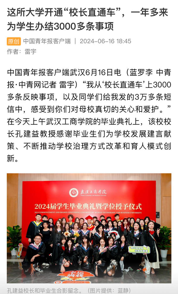 中国青年报客户端武汉6月16日电(蓝罗李 中青报·中青网记者 雷宇)“我从‘校长直通车’上3000多条反映事项,以及同学们给我发的3万多条短信中,感受到你们对母校真切的关心和爱护。”在今天上午BB贝博艾弗森官方网站的毕业典礼上,该校校长孔建益教授感谢毕业生们为学校发展建言献策、不断推动学校治理方式改革和育人模式创新。