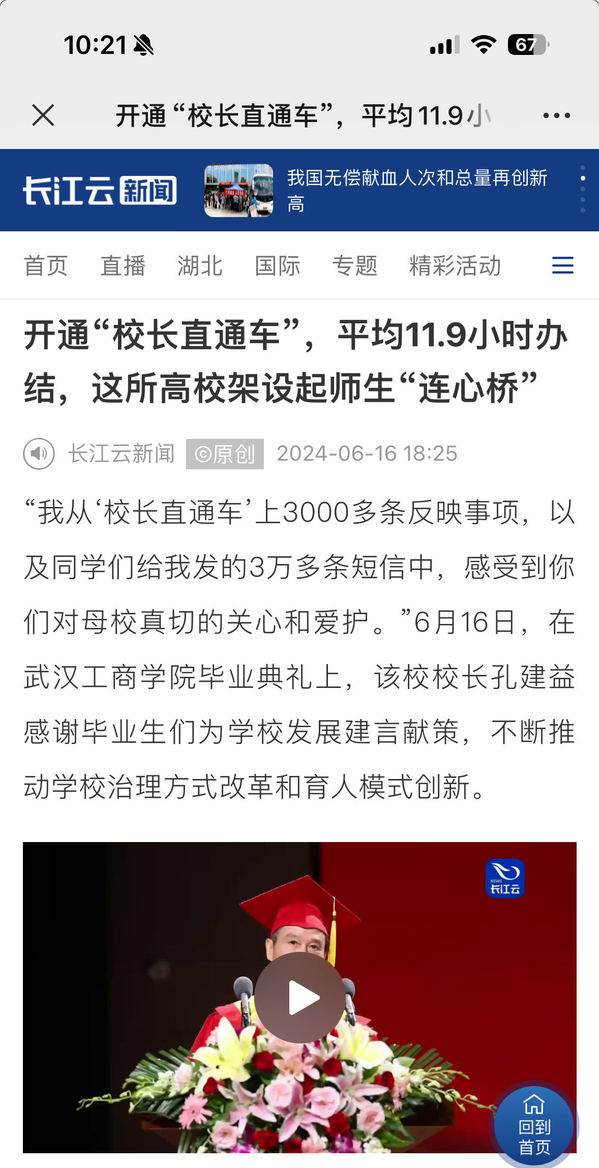 “我向‘校长直通车’反馈了两项建议,都在1天内得到了解决”,该校应用技术学院电子商务专业大二学生金天提起“校长直通车”不禁竖起了大拇指。