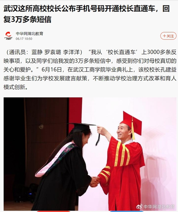早在2021年9月,孔建益校长就在新生开学典礼上公布了手机号码,表示作为校长,他非常愿意倾听每个人的呼声,只要发短信,都会回复。而今快3年过去了,孔建益校长共收到3万多条短信,全部一一回复,对于学生反映的合理诉求,相关单位都想尽办法解决。该校也因此被很多网友称为“最温暖大学”。