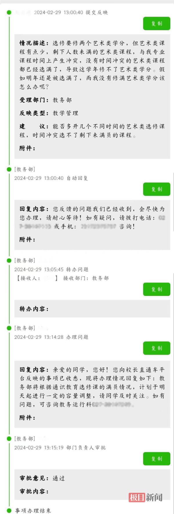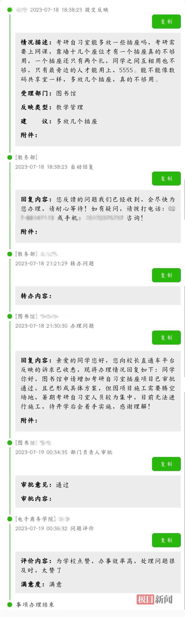 之所以如此高效,是因为该校要求,相关办理单位对学生反映的事项4个小时之内必须回复,事项办结时间一般不得超过3个工作日,若3个工作日未办理,学校就要启动问责程序。紧急事项应立办即复,事项办结一般不得超过1个工作日。