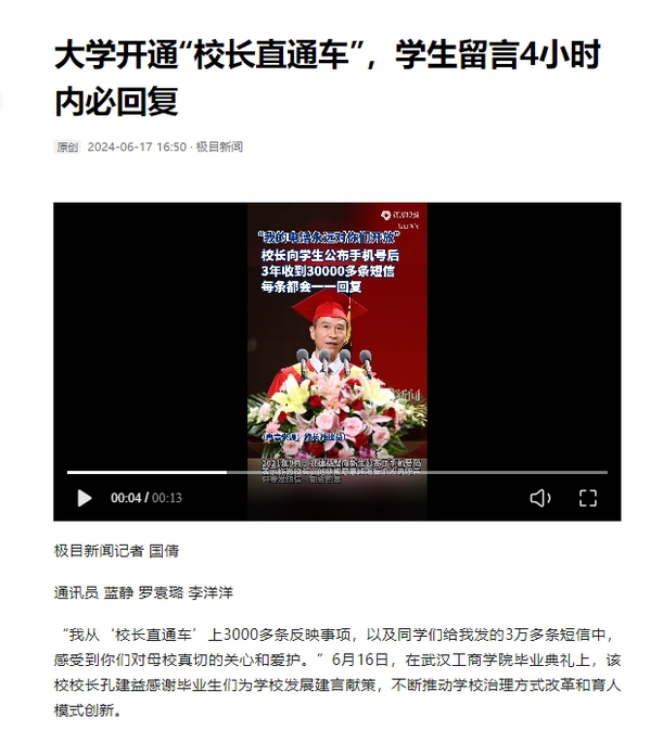 在学生们的建议下,学校的育人机制越来越完善,学生们的幸福指数也显著提升。孔建益校长表示,校长直通车平台承载着同学们对学校的信任与热爱,他非常欢迎同学们通过平台反映困难和建议,一起帮助学校成长和发展,他认为,该平台在各单位教职工的共同努力下,不仅帮助学生解决了问题,而且帮助学校优化了治理体系,提升了育人实效。