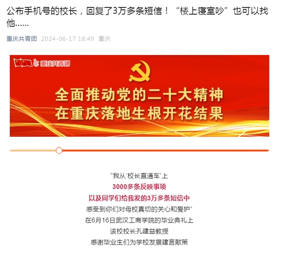 重庆共青团微信公众号:公布手机号的校长,回复了3万多条短信!“楼上寝室吵”也可以找他......