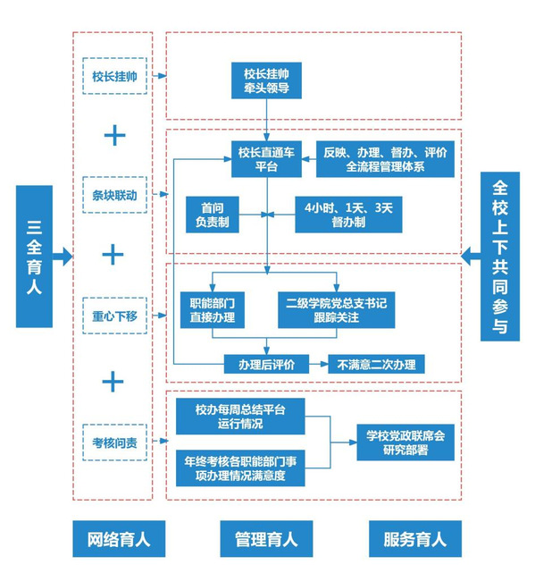 “校长直通车”平台在学校党政领导下开展工作,实行分级管理、归口办理、各负其责,建立了全校各单位协同联动、全员参与办理师生反映事项,校长、分管校领导分级督办,持续改进、动态优化制度体系的运行机制,画出“育人最大同心圆”,打造了一支由基层科级干部-部门负责人-分管校领导-校长组成的网络思政育人“生力军”。通过网上公开受理、公开办理、公开反映和公开评价的方式,确保师生诉求表达顺畅、矛盾及时调处、师生根本利益得到维护、上下有效沟通,推动学校管理、服务等各个领域的深度融合与协同发展,