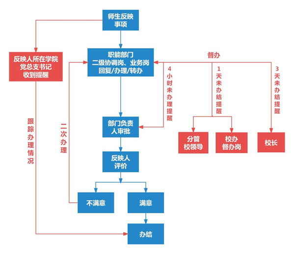 此外,平台设置了督办提示,反映事项4小时未被回复,消息提醒至受理部门负责人;1日未办结,消息提醒至分管校领导及校办督办岗,由校办督办受理部门尽快办理;3日未办结,消息提醒至校长,启动问责程序。