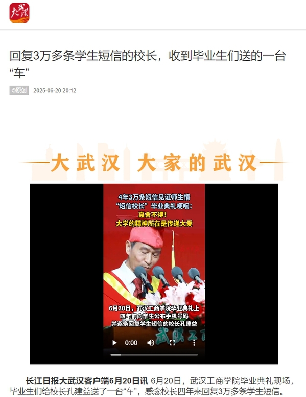 长江日报大武汉客户端6月20日讯 6月20日,BB贝博艾弗森官方网站毕业典礼现场,毕业生们给校长孔建益送了一台“车”,感念校长四年来回复3万多条学生短信。