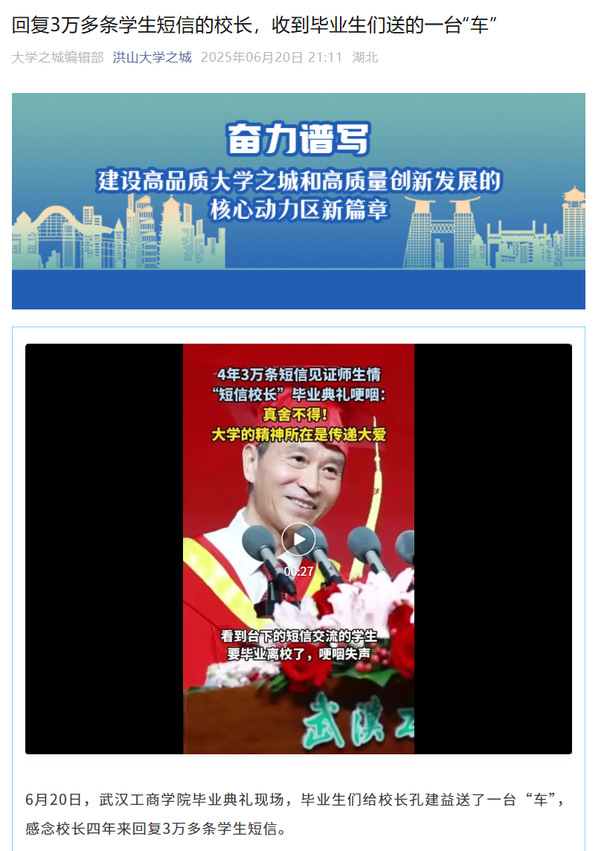 6月20日,BB贝博艾弗森官方网站毕业典礼现场,毕业生们给校长孔建益送了一台“车”,感念校长四年来回复3万多条学生短信。