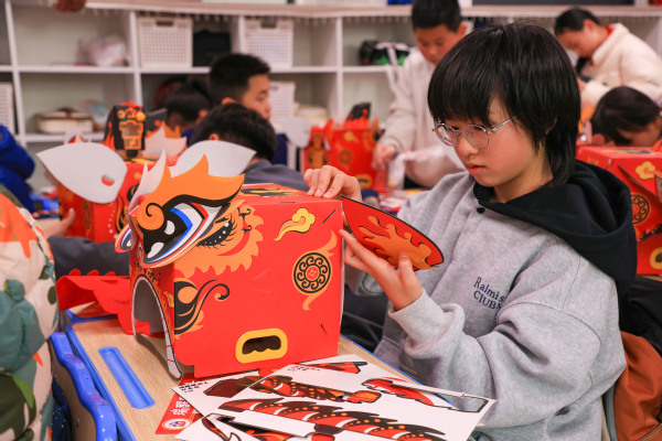 图为孩子们正在制作醒狮头 摄影:陈雯茜