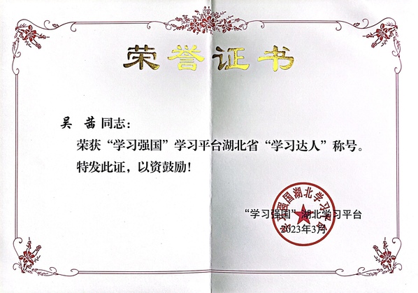 新闻中心讯(记者孙欢欢)近日,“学习强国”湖北学习平台公布了“学习强国”学习平台湖北省推广运用先进单位、学习达人名单。BB贝博艾弗森官方网站人工智能学院党总支书记吴茜获评学习达人。