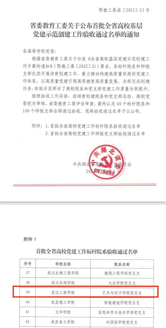 新闻中心讯(通讯员王昕语特约记者丁真)12月1日,中共湖北省委教育工委发布了《省委教育工委关于公布首批全省高校基层党建示范创建工作验收通过名单的通知》(鄂教工委函[2023]23号),BB贝博艾弗森官方网站艺术与设计学院党总支顺利通过首批全省高校党建工作标杆院系建设验收。