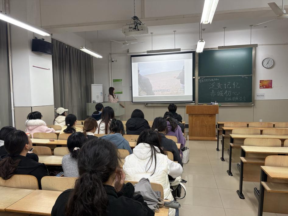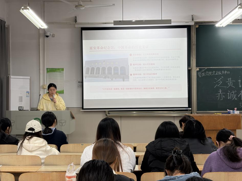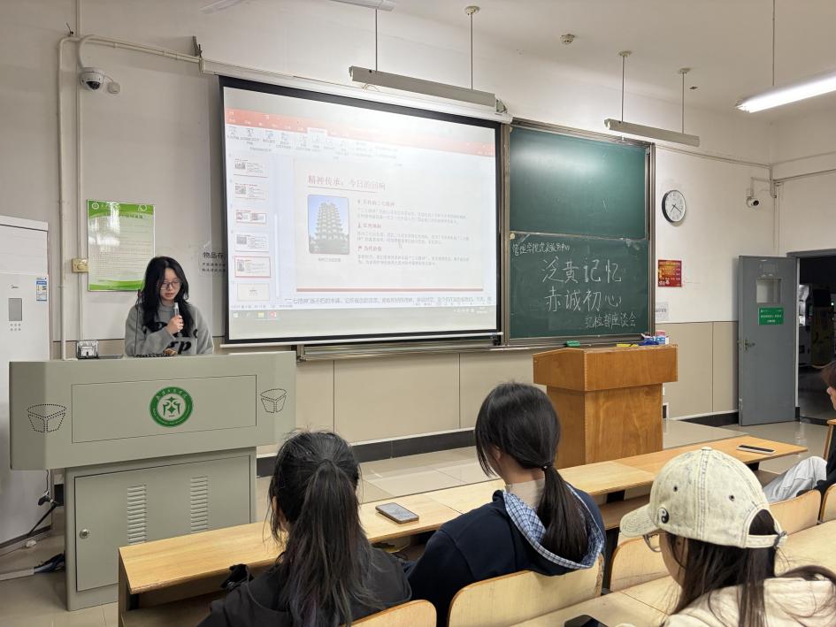 紧接着,陈诗诗同学将大家的思绪带回了革命圣地延安。她通过讲述延安革命纪念馆中的珍贵文物与历史照片,深刻阐述了“自力更生,艰苦奋斗”的延安精神。陈诗诗同学不仅讲述了历史,更分享了探访革命旧址的现实意义。她强调,探访旧址不仅仅是为了缅怀过去,更是为了在新时代中寻找精神坐标。她呼吁纪检部的同学们,在面对工作中的困难与挑战时,要发扬延安精神,不畏艰难,勇于担当,将这份宝贵的精神财富转化为服务同学的实际行动。