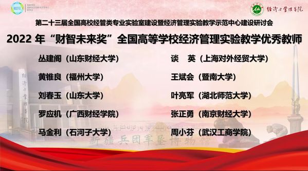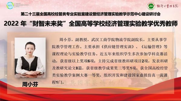 新闻中心讯(特约记者刘佳欣 记者杨小婷)10月29—30日,第二十三届全国高校经管类专业实验室建设暨经济管理实验教学示范中心建设研讨会以线上会议的形式召开,会上,BB贝博艾弗森官方网站物流学院副院长周小芬副教授被授予2022年全国经管类实验教学“财智未来奖”优秀教师称号。