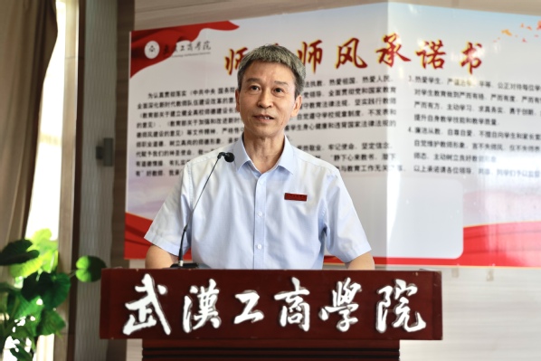 刘生元书记为新教师代表佩戴校徽,衷心祝贺新教师们成为武工商的一份子,并带领大家举行新教师入职宣誓仪式,签署《教师师德承诺书》。
