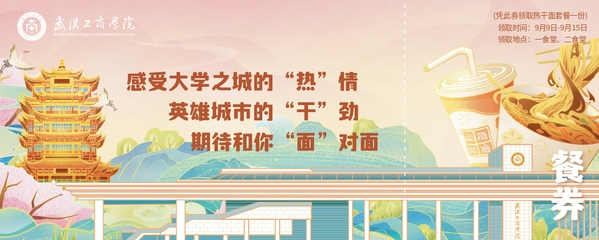 创意餐券分为主券和副券两部分,集观赏性、实用性、收藏性于一体。2023级新生到校报到、入学后,可凭副券在9月9日至9月15日期间前往学校一食堂和二食堂免费领取热干面套餐一份(包含1份热干面和豆浆),品尝武汉特色美食,感受“温暖武工商”的浓郁氛围。