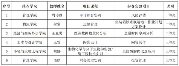 此外,物流学院教师付蒙、经济与商务外语学院教师王亚男荣获二等奖,艺术与设计学院教师王雪、环境与生物工程学院教师魏娜和管理学院教师段婧荣获三等奖。