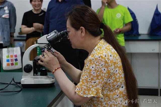 一名学生家长正在实验室使用显微镜 摄影:柳康龙