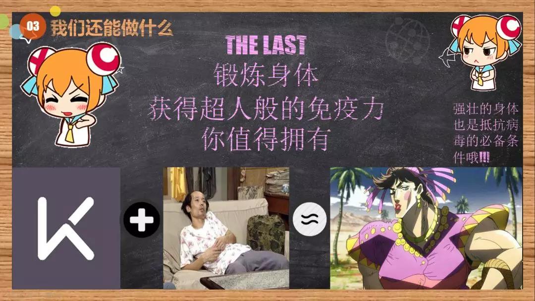 “抗击新型冠状病毒,我们在行动。我制作的PPT的亮点是结合了较多的二次元元素和较为突出的特效以展现出我PPT的风格。