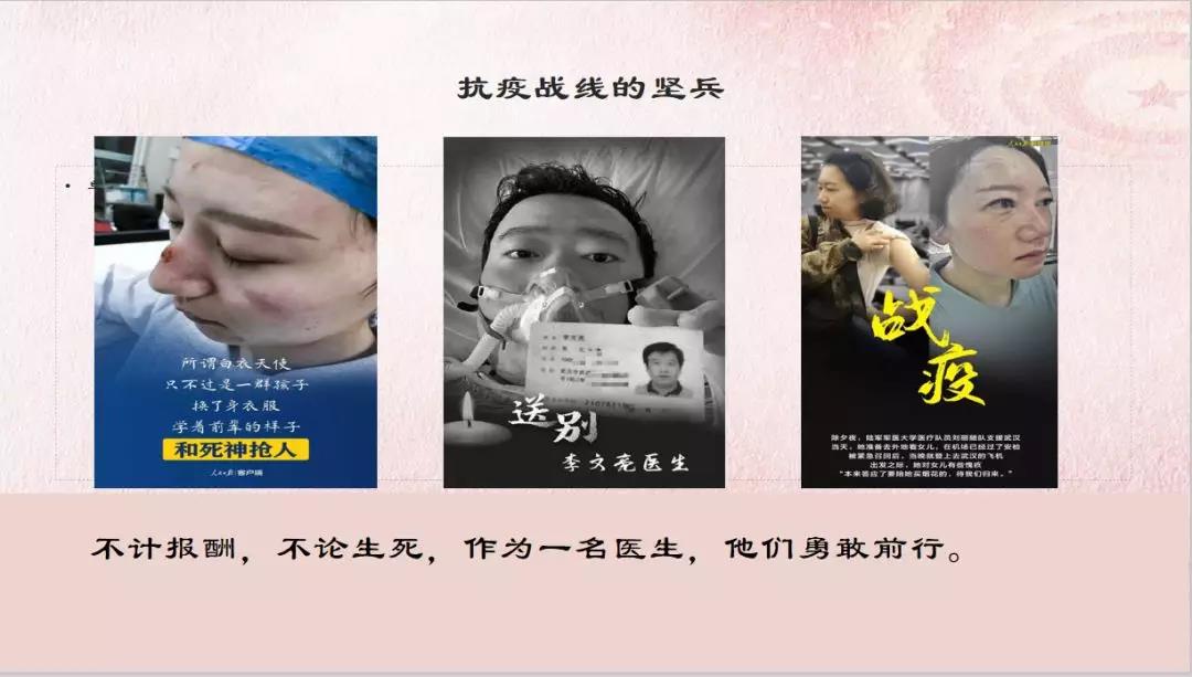 “生命可贵,医护应被崇敬。我所制作的PPT为新型冠状病毒致敬最美逆行者。没什么岁月静好,只是有人替我们负重前行。大年初一,医护人员依旧忙碌,在救死扶伤、安全保卫的第一线,坚守自己的岗位,他们用“舍”和“守”撑起百姓的安康,为人民的健康保驾护航,抗击疫情,他们一直准备着。”