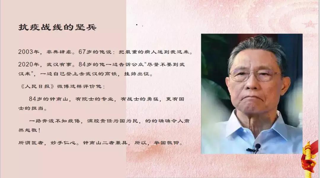 我是18计科本11的周雁同学,此次我主要选择了钟南山院士和韩红偶像来进行我此次的PPT演讲,他们一个在奔赴在抗疫最前线,一个在后面给予全国人民的财力,物力和人力,为我们提供了强有力的后援。中国有此二人,何愁疫情不去,雾霾不散,阳光不来!