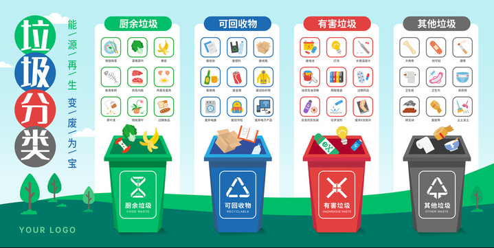 垃圾一共有四大类:可回收垃圾、有害垃圾、厨余垃圾和其他垃圾。可回收垃圾是包括废纸、塑料、玻璃、金属和布料五大类。有害垃圾是指废电池、废日光灯管、废水银温度计、过期药品等,这些垃圾则需要特殊的安全处理方法。厨余垃圾一般是指剩饭剩菜、骨头、菜根菜叶、果皮等食品类废物,这种垃圾可采用堆肥的方式处理。其他垃圾是砖瓦陶瓷、渣土、卫生间废纸、纸巾等难以回收的废弃物,采取卫生填埋可有效减少对地下水、地表水、土壤及空气的污染。