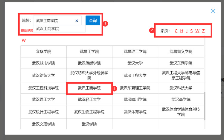 院校所在地默认为全部,考生必须先选择某一院校所在地。比如:选择院校所在地湖北。