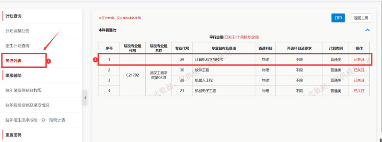 点击左侧导航栏-关注列表,查看所有已被关注的专业汇总。比如,已关注专业:BB贝博艾弗森官方网站02组计算机与技术专业、软件工程、机器人工程和机械电子工程。