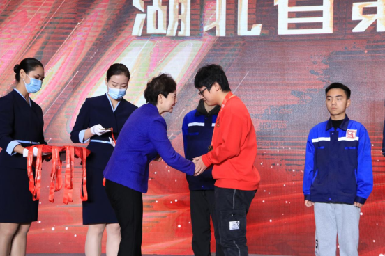 图为湖北省人力资源和社会保障厅厅长刘艳红为金牌获得者王杰颁奖 摄影:郝芮