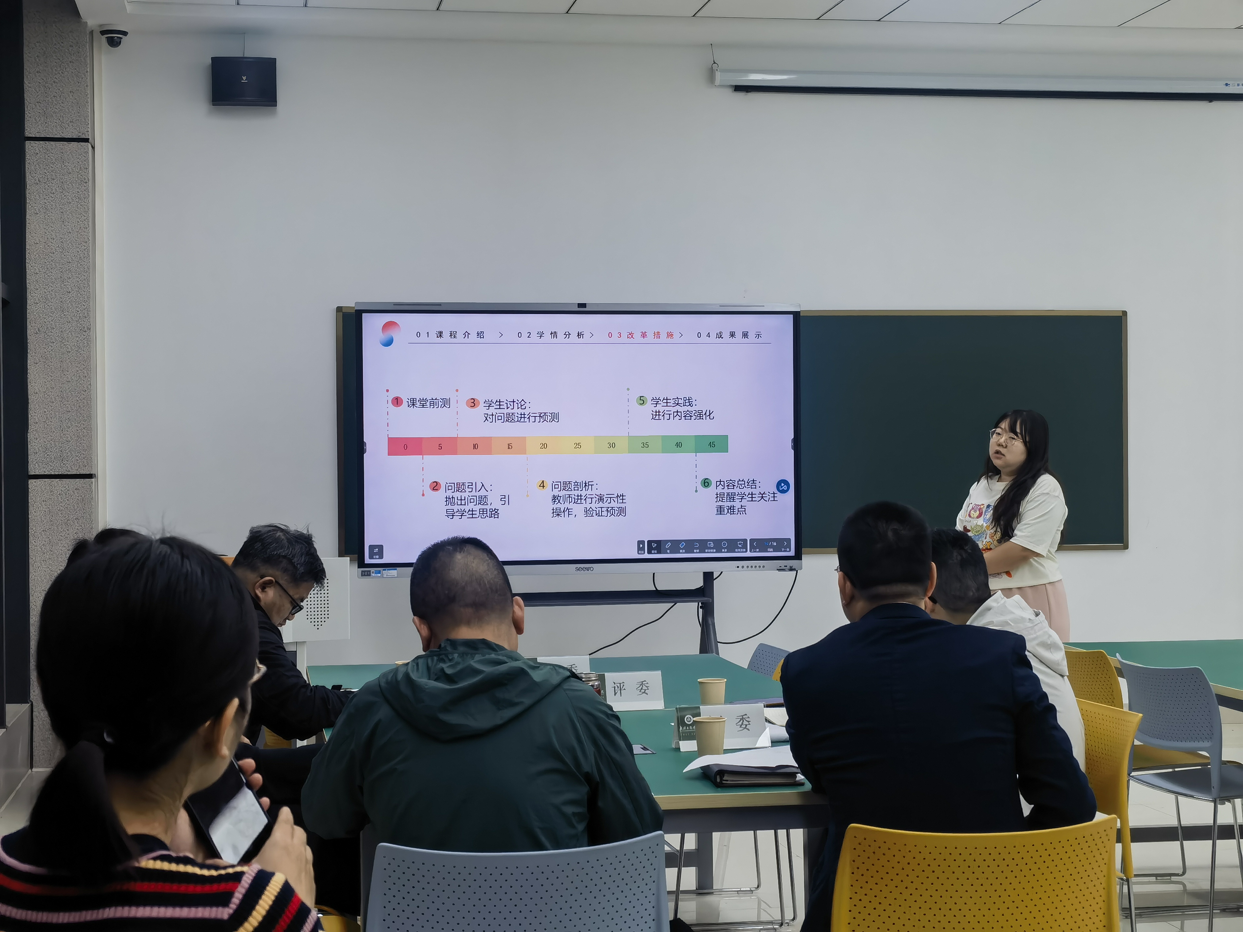 本次比赛经过学院积极动员,初赛环节共有15名教师参加,一共10组上台。汇报比赛由学院何院长、刘院长、胡院长、周俊杰老师以及督导廖教授担任评委,进行现场评价打分。