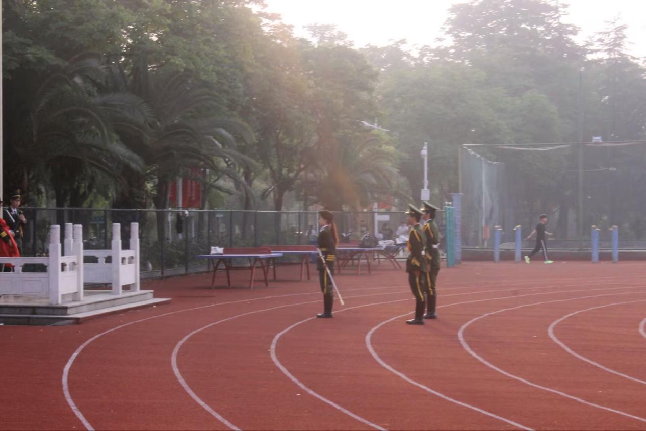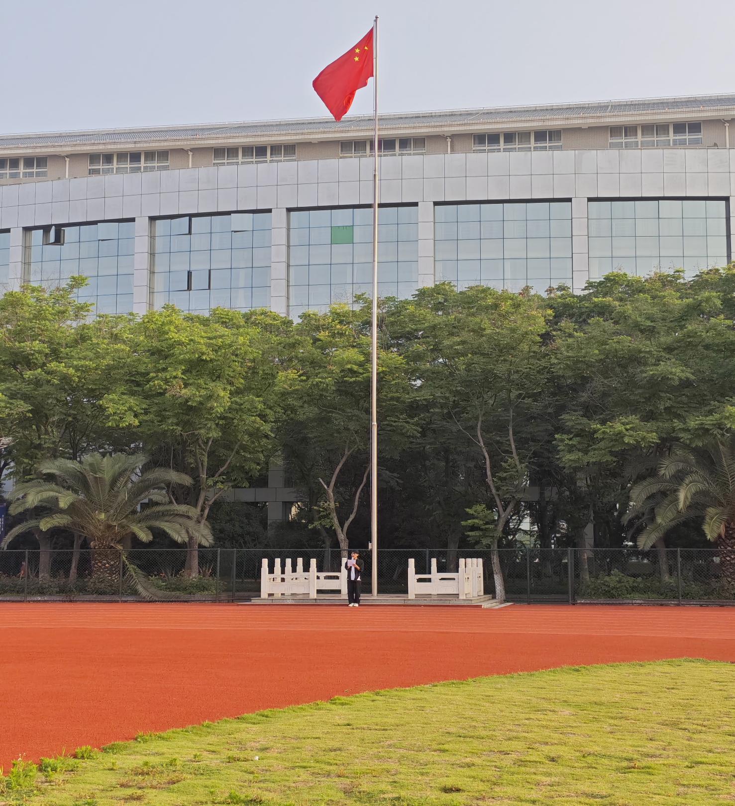 英姿飒爽的国旗护卫队迈着铿锵有力的步伐护送国旗入场,他们身姿挺拔,每一步都踏出豪爽的气势,每一个动作都尽显庄重与威严。在全体师生的注视下,伴随着《义勇军进行曲》的响起,鲜红的五星红旗冉冉升起,师生肃立凝望,以青春之名告白祖国,以计自之志践行使命担当。