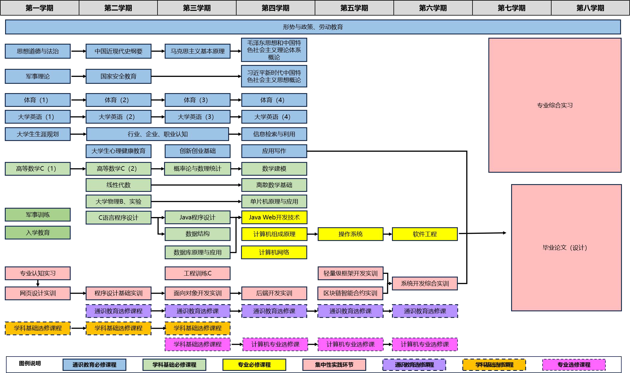 专业核心课程:C 语言程序设计、数据结构、Java 程序设计、计算机组成原理、数据库原理与应用、软件工程、操作系统、计算机网络