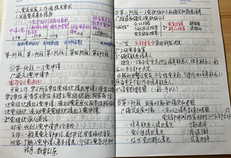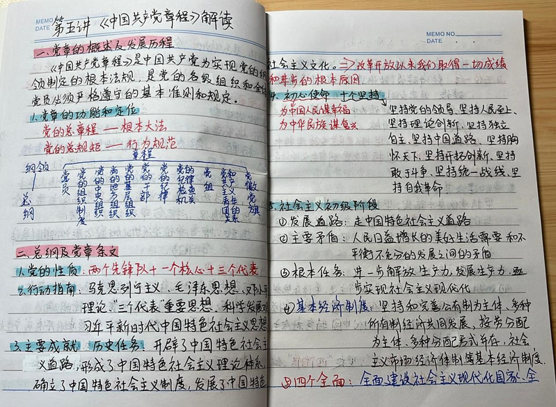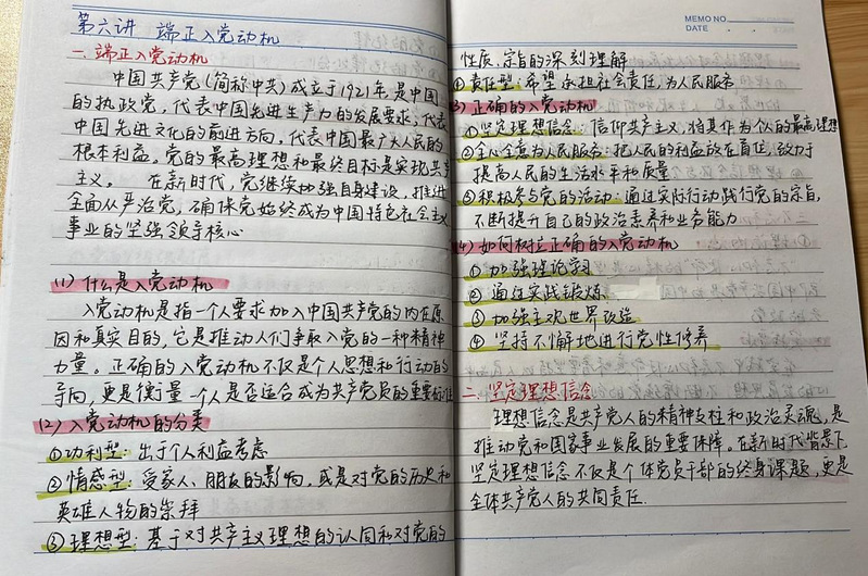 他们的字里行间里都流露着对真知的渴望和对党的高度敬仰。 一份份笔记字迹工整、条理清晰、内容具体,他们不仅精准记录了党的核心理论,更融入了个人在上完党课之后的深刻领悟。书面上用不同颜色标记分明的重难点,都折射出他们孜孜不倦的扎实学风。
