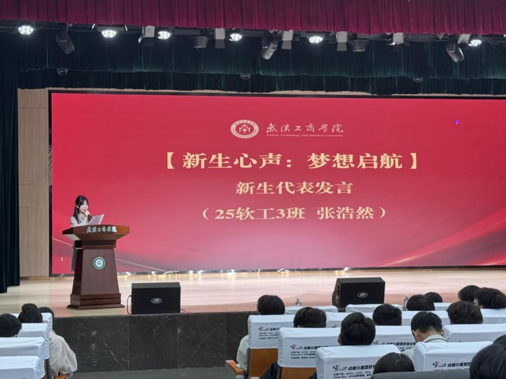 25软工3班的张浩然作为新生代表发言。“站在这里,我既激动又忐忑,但更多的是期待!”她说出了全体新生的心声,不仅分享了自己“学好编程、参与项目实践”的目标,更代表新生承诺“会尽快适应大学生活,向师长、学长虚心学习”。真挚的话语里,满是新生的朝气。