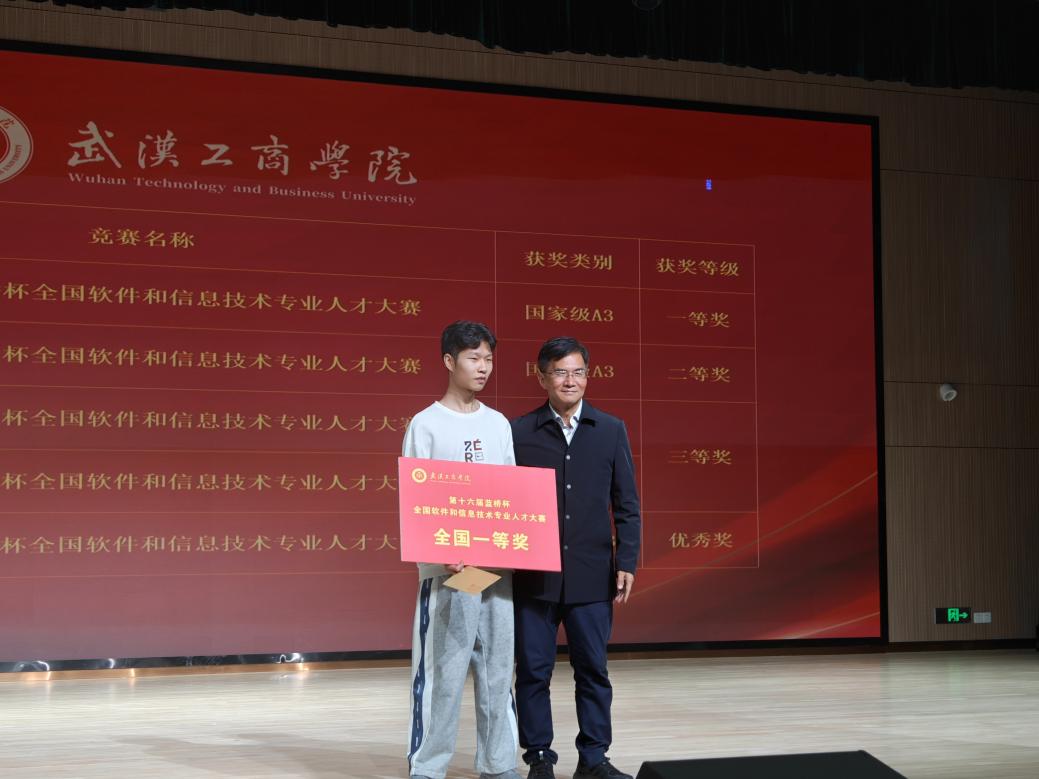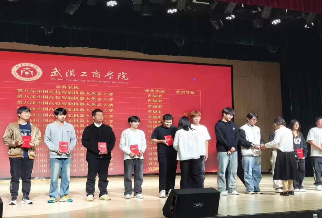 见面会上,学院举行了2024-2025学年学科竞赛颁奖仪式。当院领导宣读获奖名单——从课堂笔记大赛到学创杯,从机器人创意大赛到蓝桥杯,每一个名字背后的努力都让新生们轻声赞叹。何顶新院长等领导为获奖学生颁奖时,现场掌声不断,大屏幕同步播放的竞赛风采照片,更让新生们直观感受到“以赛促学”的魅力。