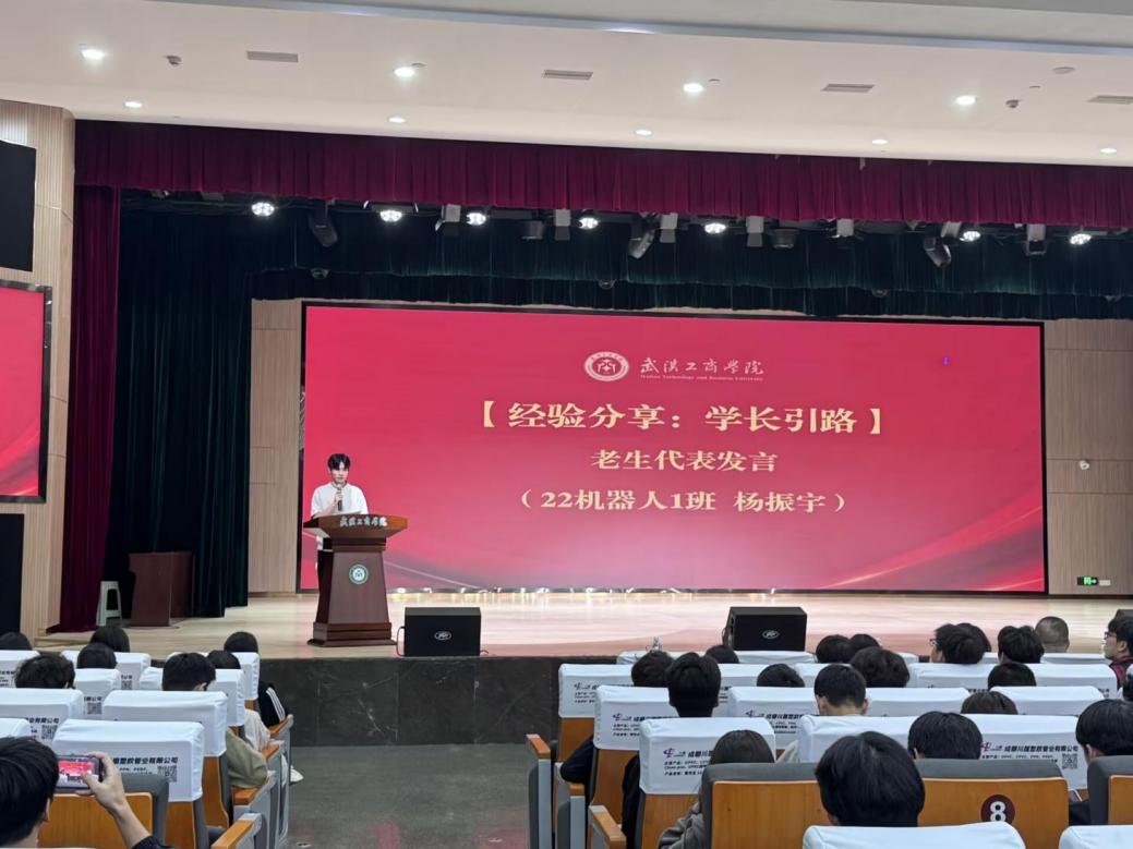 “大一是高中到大学的一个过渡,也可能是你们四年中最充满活力的一年。”22机器人1班的杨振宇作为老生代表,用自己的经历分享了“如何规划好自己想做和必须要做的事情”,他曾因社团、口语、竞赛多任务焦虑,后靠“分清主次、优先课业急事”调整状态,还提醒别错过校园美好;他建议常复习专业知识,用“夯词汇、看美剧、练听力”过四级,可冲六级备读研,同时结合自身大一竞赛失利、大二拿省一的经历,鼓励萌新大胆试错,并寄语大学是可慢慢探索的旷野,无需急追他人。