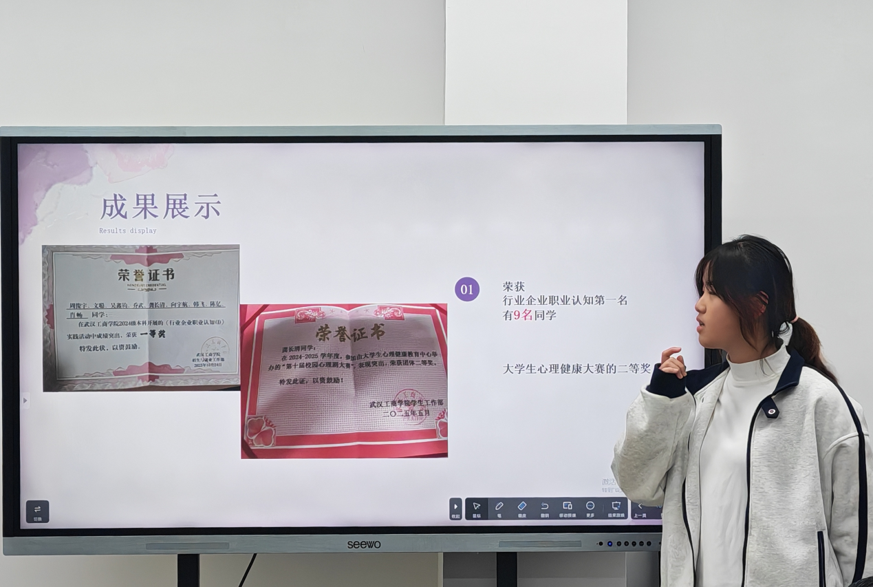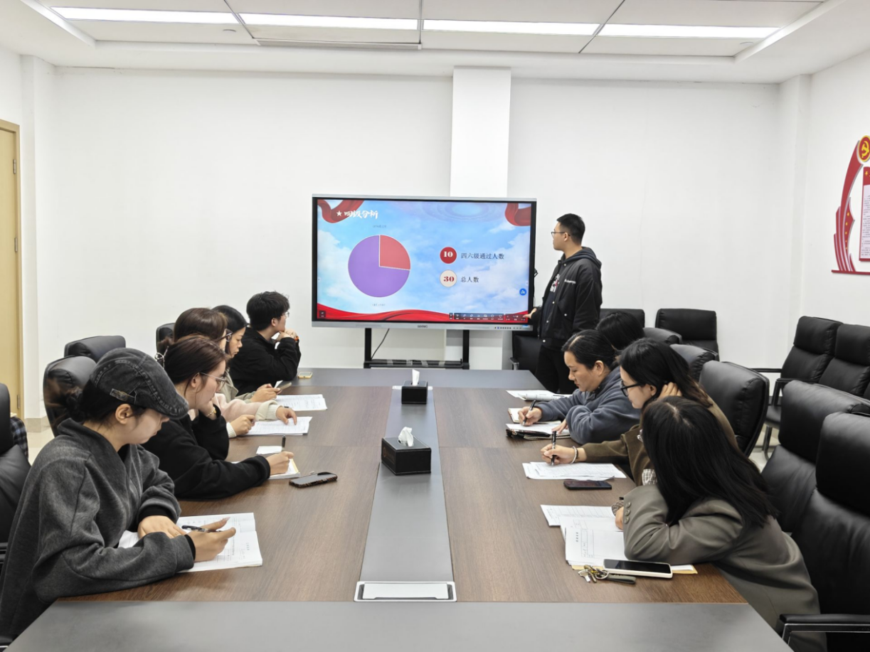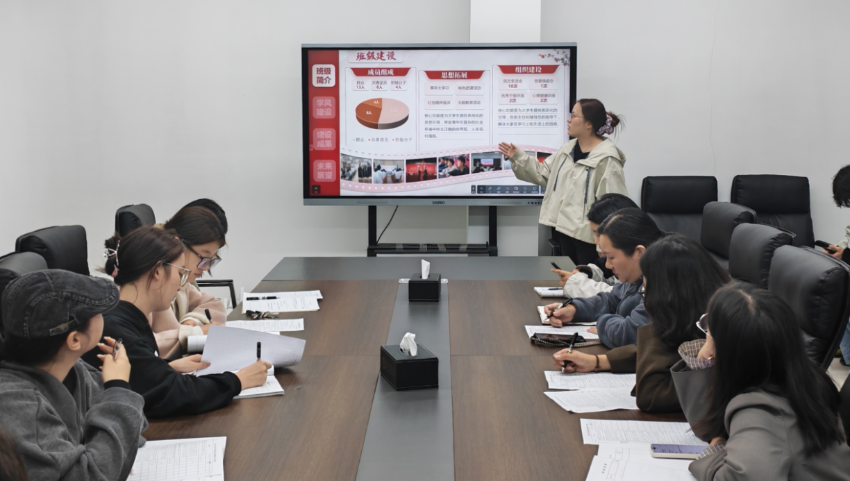 前一个班刚展示完班级四六级通过人数占总人数33%,后一个班便接棒亮出班级开展达15次的各类会议的展板,评委们的目光在不同班级的成果间来回切换,偶尔低头在评分栏里写下分数,数字的起落里藏着竞争的温度。有班级代表讲到9名同学获“行业企业职业认知第一名”;同学获“大学生心理健康大赛二等奖”时,邻座观摩的同学悄悄在笔记本上记下关键词;也有评委针对班级存在问题追问,答辩者语速稍快却逻辑清晰地回应,话音落时,会议室里泛起一阵轻声的讨论声。