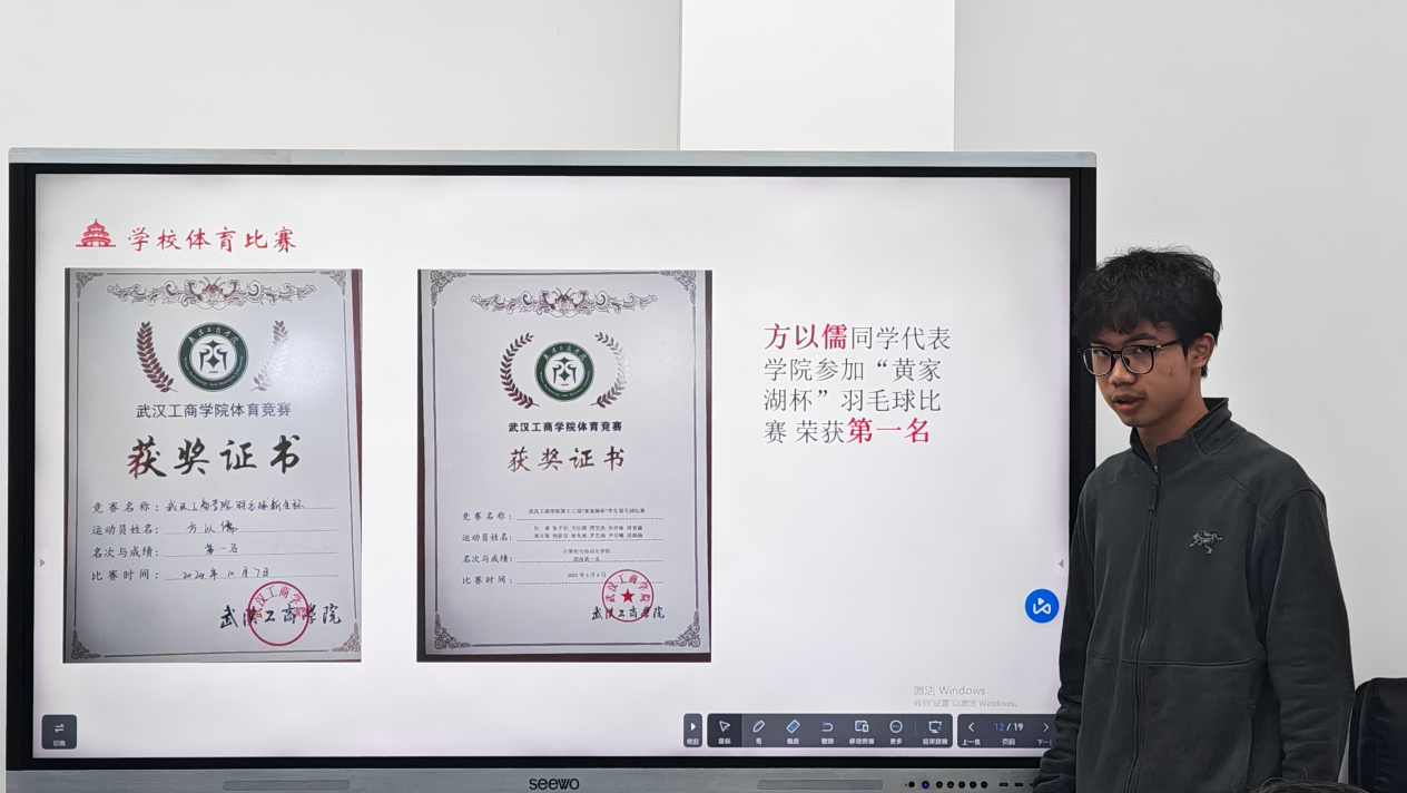长条会议桌两侧,评委们摊开评分表、握笔凝听,纸页翻动声与记录的笔尖摩挲声,衬得现场既安静又紧绷。答辩台边,班级代表们或站得笔挺,指尖轻触PPT翻页器,屏幕上跳出“方以儒同学代表学院参加“黄家湖杯”羽毛球比赛,获第一名”——每一项数据都像无声的“较量信号”。