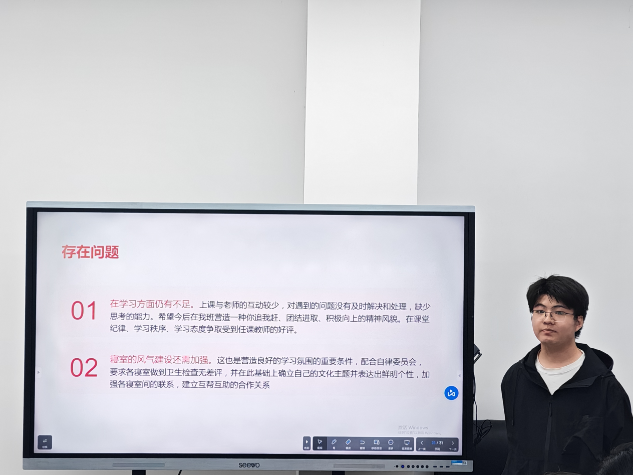 前一个班刚展示完班级四六级通过人数占总人数33%,后一个班便接棒亮出班级开展达15次的各类会议的展板,评委们的目光在不同班级的成果间来回切换,偶尔低头在评分栏里写下分数,数字的起落里藏着竞争的温度。有班级代表讲到9名同学获“行业企业职业认知第一名”;同学获“大学生心理健康大赛二等奖”时,邻座观摩的同学悄悄在笔记本上记下关键词;也有评委针对班级存在问题追问,答辩者语速稍快却逻辑清晰地回应,话音落时,会议室里泛起一阵轻声的讨论声。