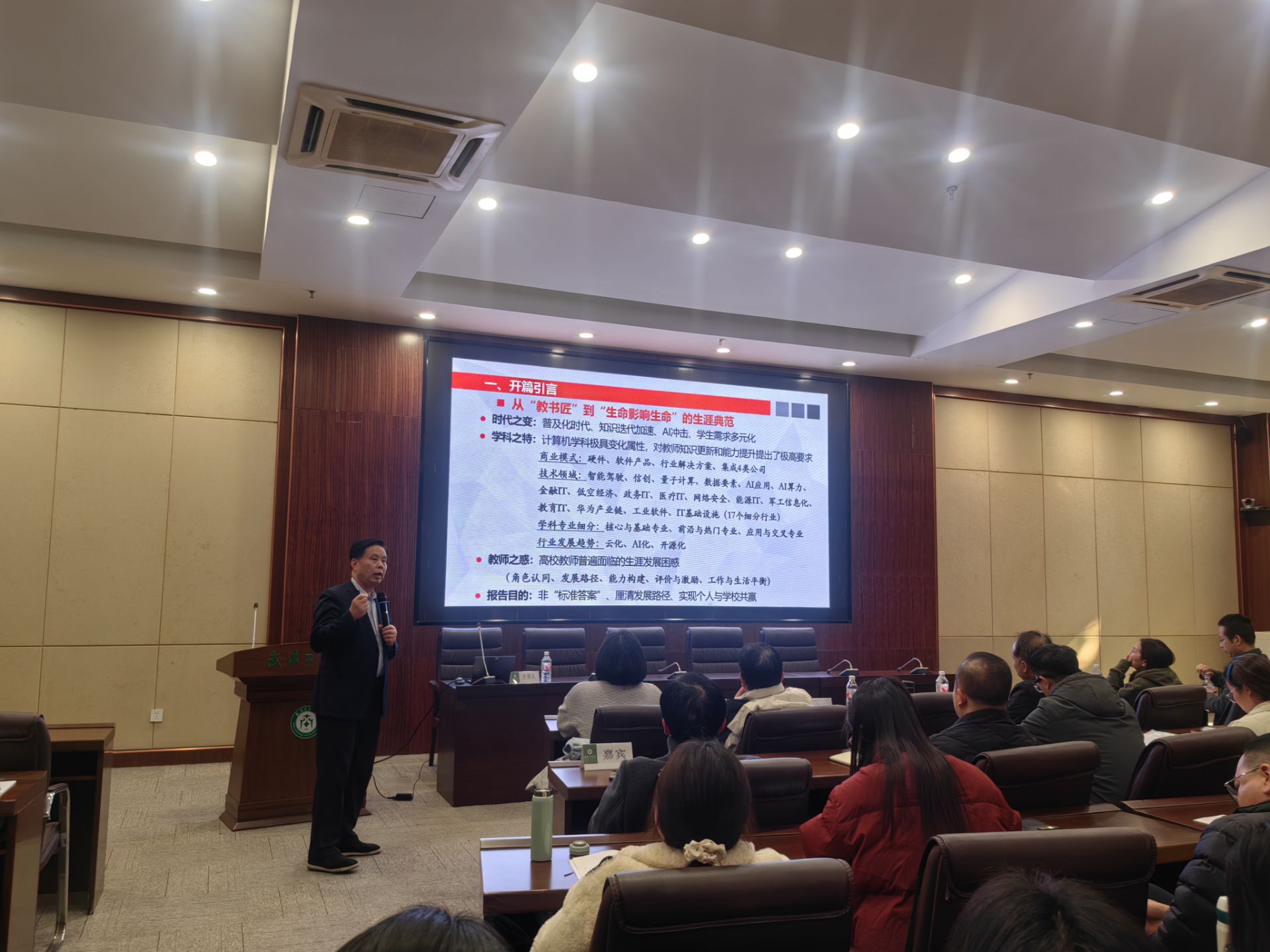为助力学院教师破解职业发展困惑,明晰成长路径,在教育普及化与AI技术变革的时代背景下实现职业价值与人生幸福的统一,11月19日,计算机与自动化学院特举办专业教师生涯发展专题讲座。本次讲座由BB贝博艾弗森官方网站副校长赵北平教授担任主讲人,湖北省教育厅原一级巡视员、湖北省生涯教育研究会会长张金元莅临指导,学院全体教师参会聆听。讲座由学院院长何顶新教授主持。