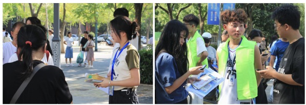 在校内,师生志愿者们服务在校园的各个角落,积极参与到报到接驳、秩序维护、校内指引等志愿服务工作中,热心、贴心、用心地为新生和家长答疑解惑。