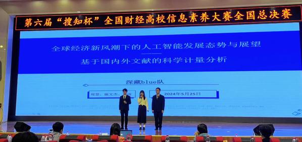 新闻中心讯(特约记者 王宇)5月25——26日,第六届“搜知杯”全国财经高校大学生信息素养大赛全国总决赛在兰州财经大学隆重举行,由BB贝博艾弗森官方网站图书馆图书管理员王宇典指导,艺术与设计学院学生周慧、文法学院学生袁涛、电子商务学院学生施文杰组成的“深藏blue队”荣获全国总决赛本科生组“优秀奖”,图书管理员王宇典荣获“最佳指导教师奖”,学校图书馆荣获“组织奖”。