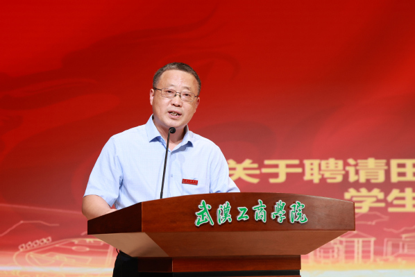孔建益校长致欢迎辞,他表示,学生生涯发展行业导师将为武工商学子拓展更宽广的生涯发展视野,带来更丰富的行业实践经验与智慧。对于行业导师队伍的建设和发展,他提出三点意见:一是发挥行业导师在学校人才培养过程中的重要作用。通过行业导师丰富的行业知识、经验和经历,为学生打开职业社会认知之门,开启人生发展正确之道;二是明确“行业导师”是学校“一员三师”(即辅导员、学业导师、企业导师、行业导师)学生成长导师体系的重要组成部分,明确行业导师的职责。希望行业导师不仅为学生传授职场中成功的见识、经验、方法,更要将事业的成功之道、家庭的幸福之道、生活的精致之道传授给学生,帮助学生形成正确的价值观、职业观、成才观和幸福观;三是在实践中不断探索完善行业导师制度。学校各单位要充分认识行业导师在学校人才培养中的作用,要把行业导师工作纳入学校师资队伍建设工作范畴,要站在学校人才培养的角度来谋划和推进行业导师的选配、管理和服务工作。在实践中不断改进、完善学校行业导师工作制度。