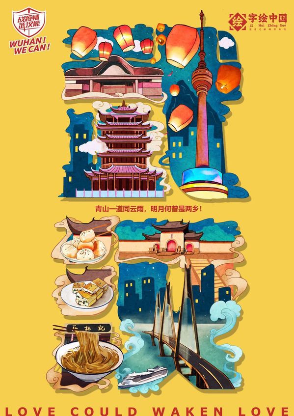 学校艺术与设计学院副院长、“字绘中国”主理人徐郑冰采用了极具特色的字绘形式,将湖北多个具有代表性的景点、美食,以及医生、警察等无私奉献的工作人员,巧妙地融入到了“武汉”“加油”4个汉字中,创作出了2幅《武汉加油》作品,他表示,疫情当前,想用创意设计的力量为武汉加油。