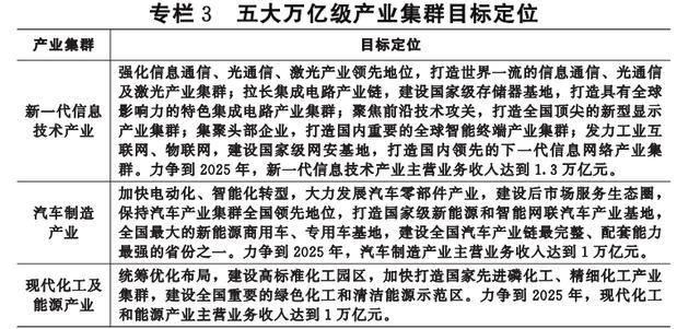(一)培育壮大战略性新兴产业。围绕“51020”现代产业集群,对每个产业集群实行一张产业地图、一个实施方案、一位省领导领衔、一个专家团队跟进、一套工作专班服务五个一工作机制。开展产业链精准招商,加快提升4个国家级战略性新兴产业集群综合竞争力,新增8个以上省级战略性新兴产业集群。打造世界一流的光芯屏端网等新一代信息技术产业,建成全国领先的汽车制造、现代化工、大健康、航空航天产业基地和现代农产品加工新高地。加快482个亿元以上重大新兴产业项目建设投产,高技术制造业增加值增长15%以上。