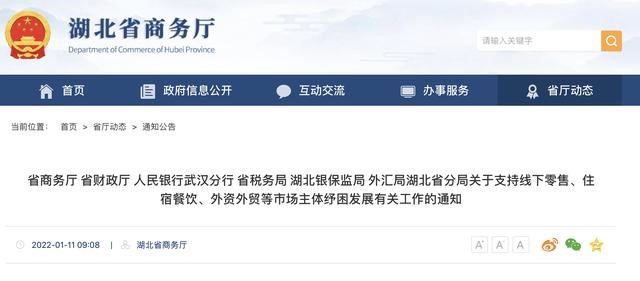 111日,省商务厅官网发布《省商务厅省财政厅人民银行武汉分行省税务局湖北银保监局外汇局湖北省分局关于支持线下零售、住宿餐饮、外资外贸等市场主体纾困发展有关工作的通知》。