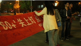 (环协通讯员:张小娟)2014年3月29日晚七点,“蓝天自造,地球一小时”活动在环协会长白云的领导下正式开始,首先是在学校综合楼广场拉横幅邀请同学们签名以表达对活动的支持。在协会成员以及各社团友人的积极参与下,签名活动举行得很成功。