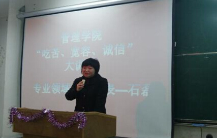管理学院分团委宣传部讯 (通讯员:叶子英)11月25日晚七点,管理学院在综合楼307组织开展了“吃苦,宽容,诚信”大讲堂第四讲。中国电信湖北财务共享服务中心主任石磊女士作为邀请嘉宾为同学们带来了此次讲座。管理学院常务副院长李明、党总支书记吴茜、副书记陈玲、院长助理陈振祥、会计系主任聂新田、分团委书记汪燕以及部分辅导员聆听了此次讲座。
