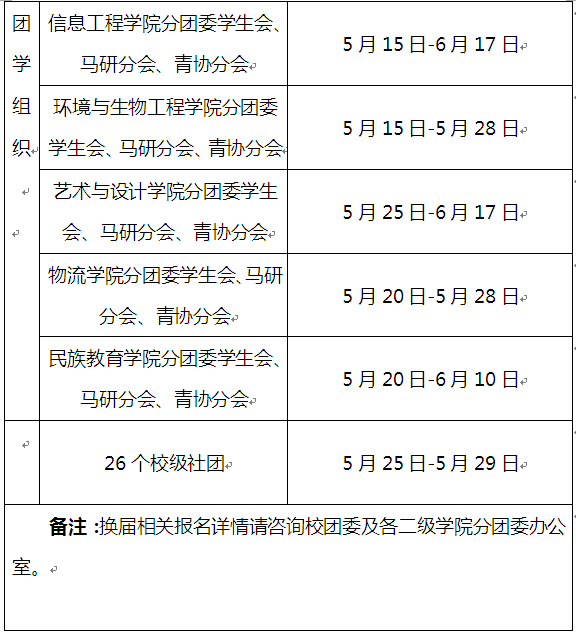 为深入贯彻党的十八届四中全会精神,全面落实党的教育方针,我校积极改进美育德教学,进一步推进素质教育,优化团学组织结构,提高全校团学干部队伍的整体素质。在校团委的直接指导下,现将我校各级团学组织换届时间安排通知如下: