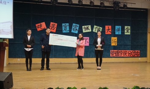 活动第一项,由我院李明老师发表讲话,对本次活动进行了介绍,对此次活动表示看好。活动第二项,红豆公司人力资源部部长蒋中一先生发表讲话,为大家介绍了红豆集团的理念和目标,他说:“红豆的基业长青,靠的就是每一代红豆人吃苦耐劳的精神,希望我们的管院学子能讲诚信、知感恩,坚定信念!”并与工商管理系主任黄霞老师完成了1万元“红豆奖励基金”的转赠仪。